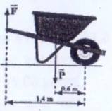 Một chiếc xe đẩy chuyển vật liệu có cấu tạo như hình vẽ. Tổng khối lượng vật liệu và xe là 80 kg. Áp dụng quy tắc mômen, tính lực nâng đặt vào tay cầm để giữ xe thăng bằng. Lấy g = 9,8 m/.