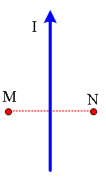 Một dòng điện có cường độ I = 5 A chạy trong một dây dẫn thẳng, dài. Hai điểm M, N nằm trong mặt phẳng hình vẽ, trong không khí chứa dòng điện và M, N cách dòng điện đều bằng d = 4 cm. Cảm ứng từ tại