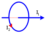 Dòng điện thẳng dài I1 được đặt vuông góc với mặt phẳng của dòng điện tròn I2. Phát biểu nào sau đây đúng.