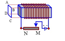 Cho một ống dây quấn trên lõi thép có dòng điện chạy qua đặt gần một khung dây kín ABCD như hình vẽ. Cường độ dòng điện trong ống dây có thể thay đổi được nhờ biến trở có có con chạy R. Nếu dịch chuyển con chạy của biến trở từ N về phía M thì