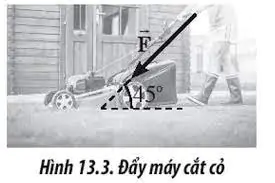 Một người đẩy máy cắt cỏ có khối lượng 15 kg di chuyển với một lực có độ lớn không đổi bằng 80 N theo phương của giá đẩy như Hình 13.3. Biết góc tạo bởi giá đẩy và phương ngang là .