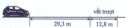 Một ô tô đang đi trên đường thẳng với tốc độ v thì trước mặt ô tô đột ngột xuất hiện một mối nguy hiểm. Trong khoảng thời gian từ khi mối nguy xuất hiện đến khi phanh hoạt động, ô tô chuyển động được quãng đường 29,3 m. Khi phanh hoạt động làm bánh xe ngừng quay, các bánh xe của ô tô để lại vết trượt dài 12,8 m trên đường, như hình vẽ. Người ta ước tính rằng trong quá trình trượt, ô tô giảm tốc với gia tốc có độ lớn là 0,85 g, trong đó g là gia tốc rơi tự đo.
