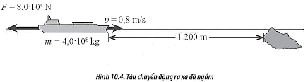 Một tàu chở hàng có tổng khối lượng là 4,0. kg vận chuyển hàng hóa đến nơi tiếp nhận thì đột nhiên động cơ tàu bị hỏng, lúc này gió thổi tàu chuyển động thẳng về phía bãi đá ngầm với tốc độ không đổi 0,8 m/s. Khi tàu chỉ còn cách bãi đá ngầm một khoảng 1200 m thì gió ngừng thổi, đồng thời động cơ cũng được sửa chữa xong và hoạt động lại. Tuy nhiên bánh lái của tàu bị kẹt và vì vậy, tàu chỉ có thể tăng tốc lùi thẳng ra xa khỏi bãi đá ngầm (Hình10.4). Biết lực do động cơ sinh ra có độ lớn 8,0. N và lực cản xem như không đáng kể.