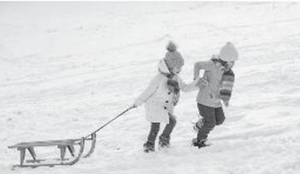 Trong hình có hai bạn nhỏ đang kéo một chiếc xe trượt tuyết. Xét lực kéo có độ lớn 45 N và góc hợp bởi dây kéo so với phương ngang là 40 độ.
