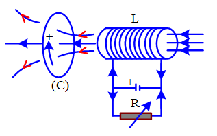 Một vòng dây dẫn kín (C) được đặt đối diện với đầu của ống dây dẫn L hình trụ mắc trong mạch điện, chọn chiều dương trên (C) được chọn như hình vẽ.