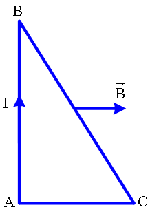Một dây dẫn được uốn thành một khung dây có dạng hình tam giác vuông ABC có AB = 8 cm, AC = 6 cm như hình vẽ. Đặt khung dây vào trong từ trường đều có véc tơ cảm ứng từ song song với cạnh AC, có độ lớn B = 5 T. Coi khung dây nằm cố định trong mặt phẳng hình vẽ. Khi dòng điện chạy trong khung dây có cường độ I = 5 A thì độ lớn lực từ do từ trường đều tác dụng lên các cạnh AB, BC và CA lần lượt là . Giá trị của () là