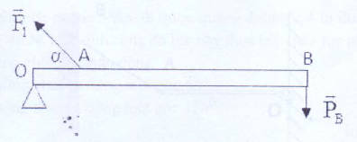 Thanh AB đồng chất, tiết diện đều dài 80 cm, có khối lượng không đáng kể, có trục quay tại O. Cho OA = 30 cm, F = 2 N, α = Hỏi phải tác dụng vào đầu A một lực bằng bao nhiêu để thanh AB cân bằng ngang?