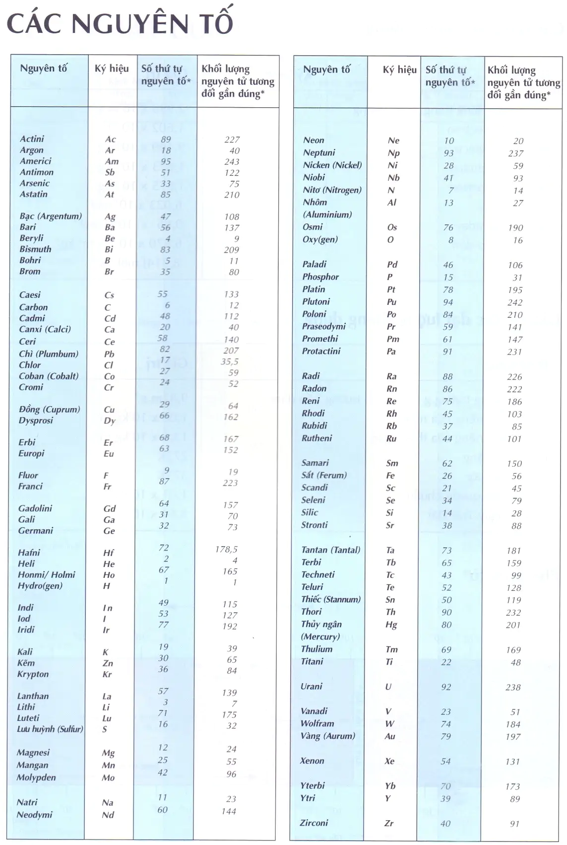 Bảng tra cứu khối lượng nguyên tử tương đối gần đúng