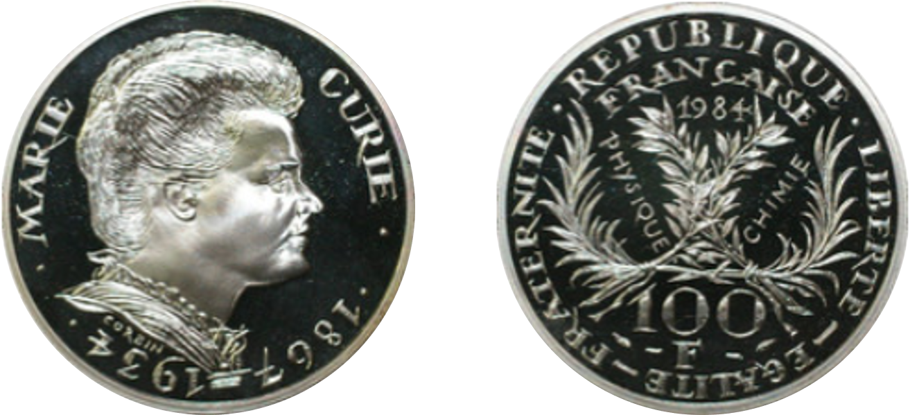 Hình ảnh của bà Marie Curie xuất hiện trên đồng tiền của cả hai quốc gia Pháp và Ba Lan. Bà sinh ra và lớn lên ở Ba Lan, tên đệm theo họ cha Skłodowska nhưng làm việc tại Pháp và lấy chồng người Pháp, ông Pierre Curie.
