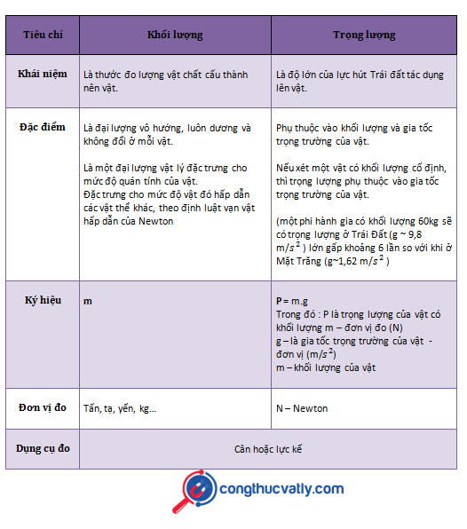 Như vậy, từ bảng so sánh chúng ta có thể nhận thấy được hai khái niệm khối lượng và trọng lượng là khác nhau, và rằng những câu nói thường ngày mà chúng ta vẫn đâu đó nghe được là chưa thật sự chính xác, bởi nếu như khối lượng là một đại lượng không đổi dù có ở trên mặt đất, dưới đáy biển, thì trọng lượng lại là một đại lượng có thể thay đổi bởi nó phụ thuộc vào gia tốc g – vị trí đặt vật.