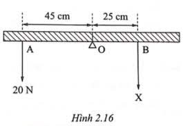 Một thanh đồng chất tì lên giá đỡ tại O và được giữ nằm cân bằng với lực đặt tại A và B như hình 2.16. Vì thanh cân bằng nên hai lực tại A và B sẽ cho hợp lực đặt tại O. Độ lớn của lực tại B là