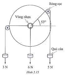 Một học sinh kiểm tra lại quy tắc tổng hợp lực đồng quy bằng cách bố trí thí nghiệm với các quả cân, ròng rọc, dây nối và một vòng nhựa mảnh, nhẹ. Lúc đầu vòng được giữ như hình 2.15.