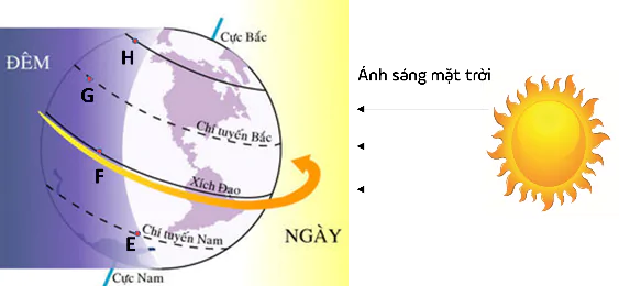 Quan sát hình và cho biết trong số các vị trí E, F, G, H thì người đứng ở vị trí nào sẽ thấy Mặt Trời mọc trước.