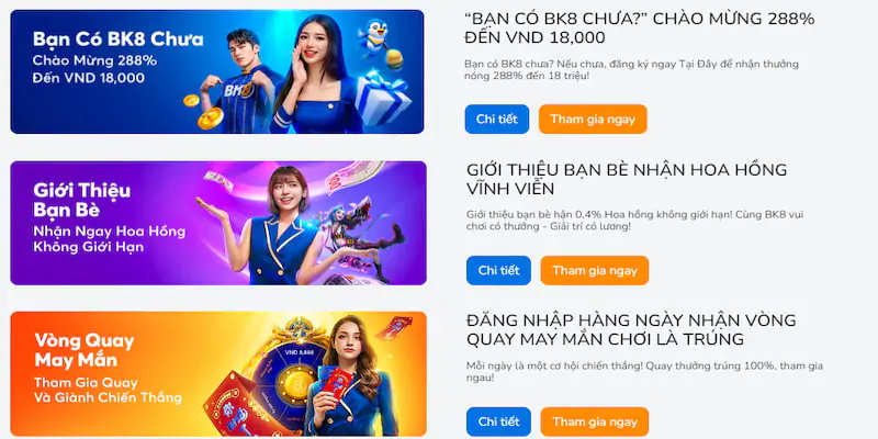 Ngoài việc được trải nghiệm những siêu phẩm Slots Game BK8 đặc sắc bạn còn có cơ hội nhận về nhiều ưu đãi giá trị. Các chương trình khuyến mãi trang cược đưa ra sẽ giúp cho mọi người có thêm vốn để tham gia giải trí lâu dài hơn, điển hình như: