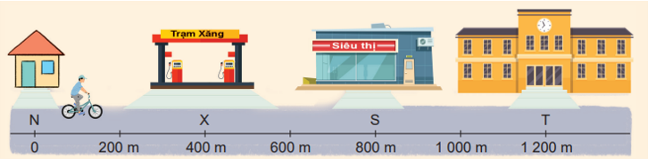 Xét quãng đường AB dài 1000 m với A là vị trí nhà của em và B là vị trí của bưu điện (Hình vẽ). Tiệm tạp hóa nằm tại vị trí C là trung điểm của AB.
