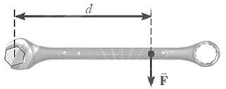 Lực F có độ lớn 10 N tác dụng vuông góc lên cờ lê để làm xoay bu lông.