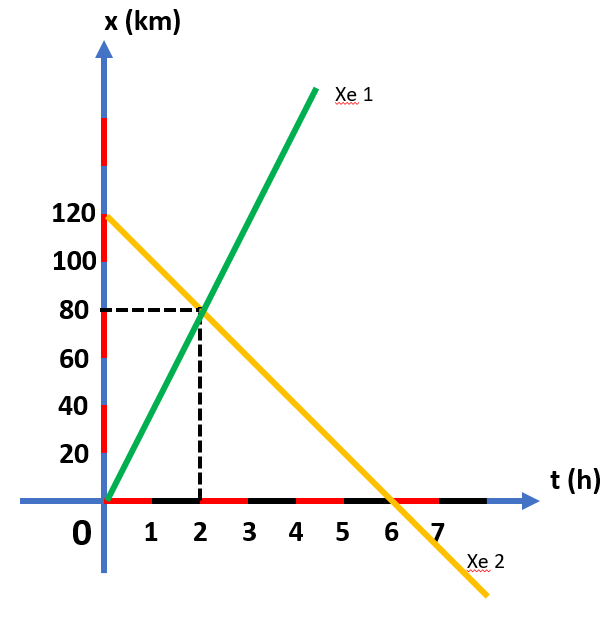 Cho đồ thị như hình vẽ. Dựa vào đồ thị, hãy lập phương trình chuyển động của hai xe.