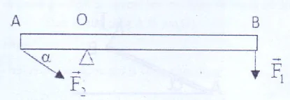 Thanh AB đồng chất, tiết diện đều dài 22 cm, có khối lượng m = 200 g có thể quay quanh O. Cho OA = 8 cm, g = 10 m/, = 3 N, α = . Tìm độ lớn của để thanh AB cân bằng ngang.