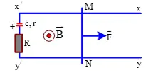 Thanh dẫn điện MN = 15 cm, B = 0,5 T. Thanh MN chuyển động thẳng đều về phía x'y' với 3 m/s. R = 0,5 ôm. Dòng điện cảm ứng qua R có độ lớn là bao nhiêu?