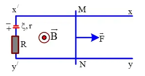 Dạng bài: Vật lý 11. Thanh dẫn điện MN dài 60 cm, chuyển động trên hai thanh ray song song, B = 1,6 T. Hai đầu x'y' nối với nguồn điện 0,96 V, r = 0,1 Ω và R = 0,2 Ω. Lực D nằm trong mặt phẳng, chuyển động đều 0,5 m/s. Giá trị F gần giá trị nào nhất sau đây? Hướng
