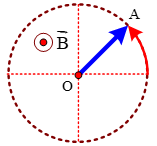 Thanh kim loại OA dài 1 m quay đều trong mặt phẳng hình vẽ xung quanh trục quay A đi qua điểm O, thanh OA cắt các đường sức từ của một từ trường đều B = 0,04 T. Cho biết thời gian quay một vòng hết là 0,5 s. Vectơ cảm ứng từ có phương song song với A. Suất điện động cảm ứng trong thanh OA có độ lớn gần giá trị nào nhất sau đây?
