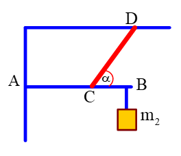 Thanh AB khối lượng , chiều dài gắn vào tường bới bản lề A. Đầu B của thanh treo vật nặng . Thanh được giữ cân bằng nằm ngang nhờ dây treo CD; góc α = 45°, biết .