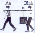 An và Bình đang khiêng một thùng hàng khối lượng 30 kg bằng một đòn tre dài 2,2 m như hình. Hỏi phải treo thùng hàng ở điểm nào để lực đè lên vai Bình lớn hơn.