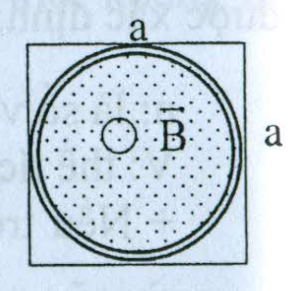Hình tròn tâm O biểu diễn miền trong đó có từ trường đều. Một khung dây hình vuông cạnh a = 20 cm ngoại tiếp với hình tròn. Biết . Tính từ thông qua vòng dây hình tròn.
