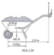 Một xe đẩy chở đất như trong hình 2.20. Xét với trục quay là trục bánh xe. Tính mômen lực gây ra bởi trọng lực P = 400 N tác dụng lên đất trong xe.