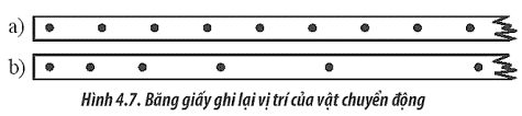 Trong Hình 4.7 có hai băng giấy ghi lại vị trí của vật chuyển động sau những khoảng thời gian bằng nhau. Hãy mô tả chuyển động của vật trong hai trường hợp này.
