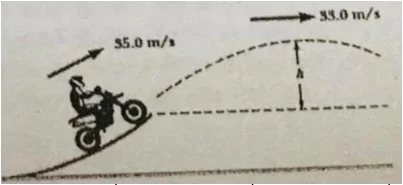 Trong một buổi trình diễn xe máy xiếc nghệ thuật, diễn viên cho xe chạy rời khỏi máng cong với tốc độ 35 m/s và tại điểm cao nhất của quỹ đạo tốc độ của xe giảm còn 33 m/s như Hình 3.15.