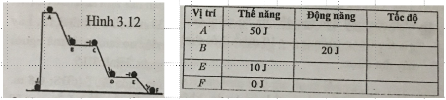 Quả bóng có khối lượng 1 kg bắt đầu trượt không vận tốc đầu từ A như Hình 3.12. Bỏ qua mọi ma sát và lực cản không khí. Hãy điền các giá trị còn thiếu vào các ô còn trống trong bảng bên dưới. Lấy giá trị gia tốc trọng trường