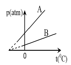 Cho đồ thị của áp suất theo nhiệt độ của hai khối khí A và B có thể tích không đổi như hình vẽ. Nhận xét nào sau đây là sai.