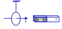 Một khung dây dẫn tròn, nhẹ, được treo bằng sợi dây mềm, đường thẳng x'x trùng với trục của khung dây, một nam châm thẳng đặt dọc theo trục x'x, cực Bắc của nam châm gần khung dây như hình vẽ. Tịnh tiến nam châm