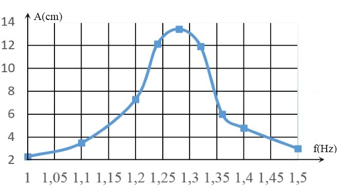 Khảo sát thực nghiệm một con lắc lò xo gồm vật nhỏ có khối lượng và lò xo có độ cứng , dao động dưới tác dụng của ngoại lực , với không đổi và thay đổi được. Kết quả khảo sát ta được đường biểu diễn biên độ của con lắc theo tần số có đồ thị như hình vẽ. Giá trị của xấp xỉ bằng?
