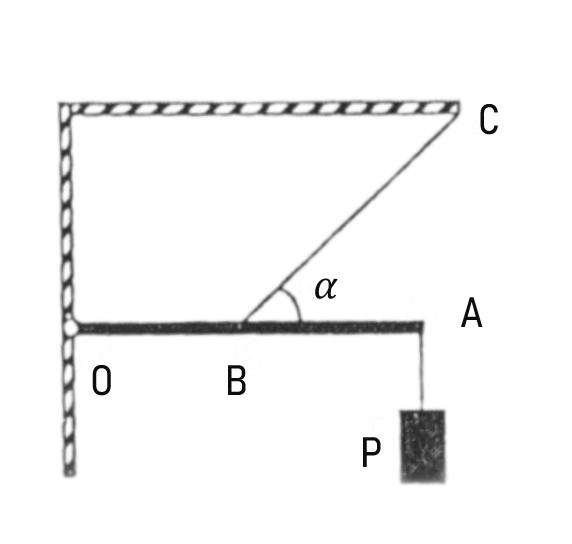Thanh OA nhẹ gắn vào tường nhờ bản lề O. Đầu A có treo vật nặng với trọng lượng P = 5 N. Để giữ cho thanh OA nằm ngang cân bằng thì ta dùng dây treo vào B và C (hình vẽ). Biết OB = AB = 0,4 m và góc α có thể thay đổi bằng cách di chuyển điểm C.