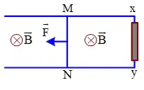 Cho thanh dẫn điện MN đặt nằm ngang trên hai thanh ray dẫn điện x'x, y'y như trên hình vẽ. Hai thanh ray đủ dài được đặt trong từ trường đều đủ rộng, hướng vuông góc với mặt phẳng chứa hai thanh. Lúc đầu thanh MN đứng yên. Tác dụng lên thanh MN lực F không đổi hướng về bên trái (phía x’y’) làm cho MN chuyển động. Giả thiết điện trở của thanh MN và hai thanh ray rất nhỏ, ma sát giữa MN và hai thanh ray rất nhỏ thì thanh chuyển động thẳng nhanh dần