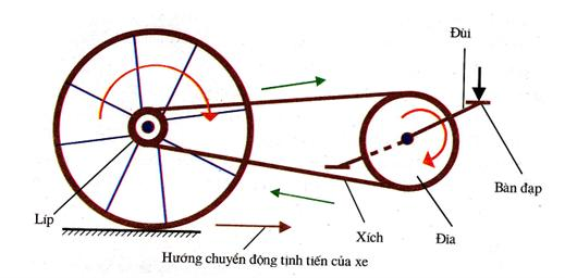 Hệ thống truyền lực và chuyển động có tác dụng truyền lực và truyền động. Khi chúng ta đạp bàn đạp, lực truyền qua đùi xe làm trục giữa quay, đĩa quay kéo xích chuyển động, xích kéo líp cùng bánh sau quay (bánh chủ động), khi bánh xe quay và lăn trên mặt đường làm cho xe chuyển động về phía trước. Nguyên tắc truyền động như sau: Lực từ chân người đạp bàn đạp đùi xe trục giữa đĩa xích líp bánh xe sau xe chuyển động.
